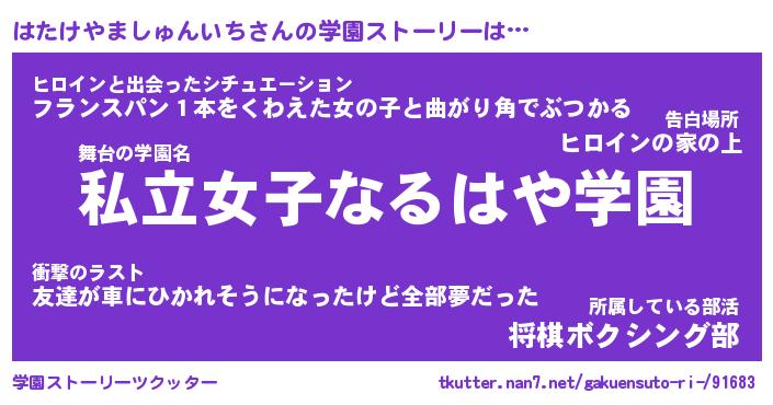 | 伝説のあだ名 | 『封印されしスナイパーはたけやましゅんいち』 |