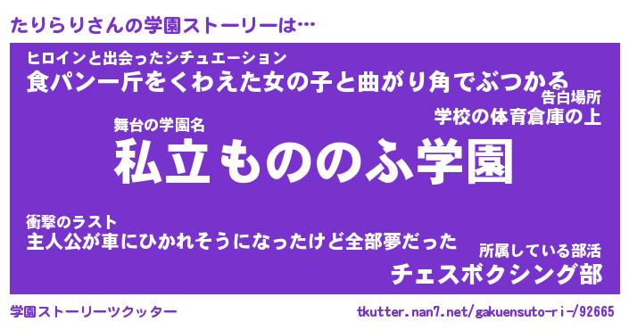 | 女子向けラノベタイトル風あだ名 | 『(仮)たりらりのやんごとなき事情』 |