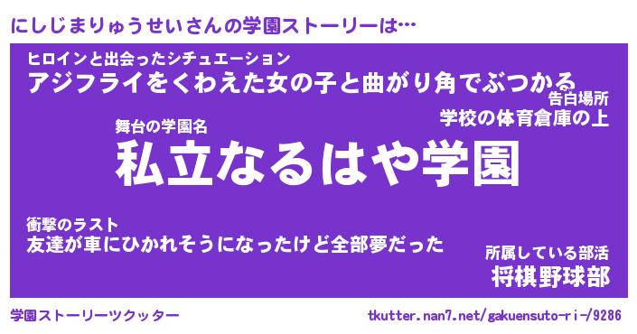 | 男性向けラノベタイトル風あだ名 | 『にしじまりゅうせいの憂鬱』 |