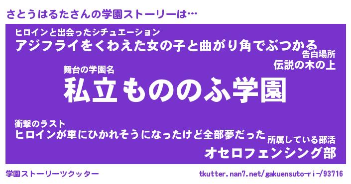 | ヒーロー風カッコイイあだ名 | 『スーパーサトウハルタ』『天弓騎士サト』 |