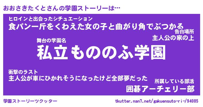 | 男性向けラノベタイトル風あだ名 | 『おおさきたくとの憂鬱』 |