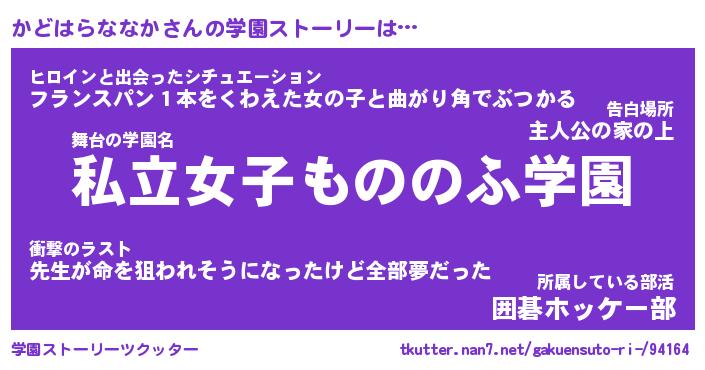 | 男性向けラノベタイトル風あだ名 | 『カドハラナナカアートオンライン』 |