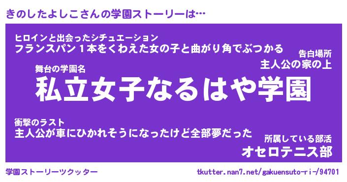| 男性向けラノベタイトル風あだ名 | 『キノシタヨシコアートオンライン』 |