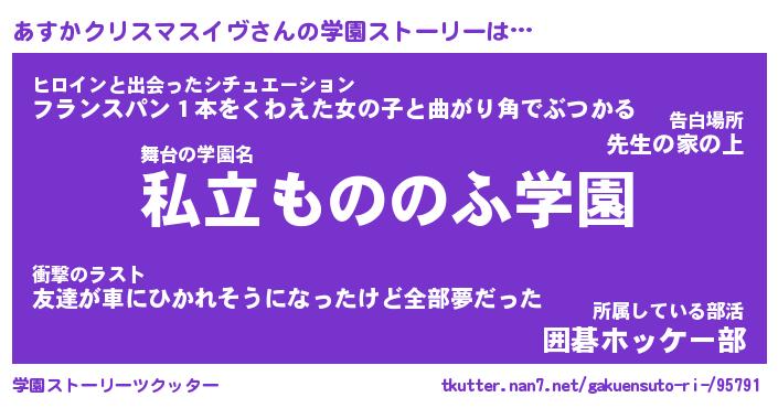 | 男性向けラノベタイトル風あだ名 | 『あすかクリスマスイヴの憂鬱』 |