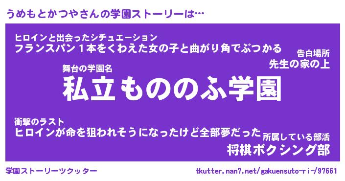 | 男性向けラノベタイトル風あだ名 | 『うめもとかつやの憂鬱』 |