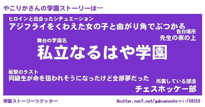 | 伝説のあだ名 | 『伝説のスナイパーやこりか』 |