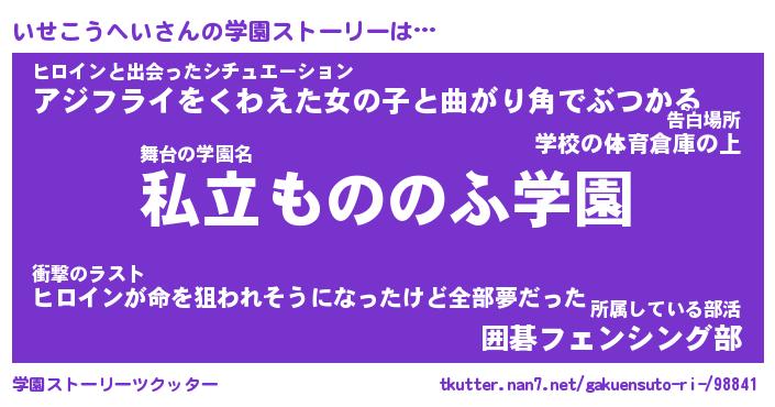 | 女子向けラノベタイトル風あだ名 | 『(仮)いせこうへいのやんごとなき事情』 |