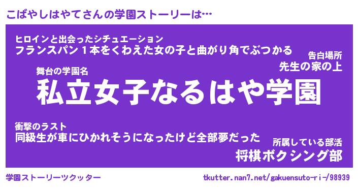 | 伝説のあだ名 | 『封印されしスナイパーこばやしはやて』 |