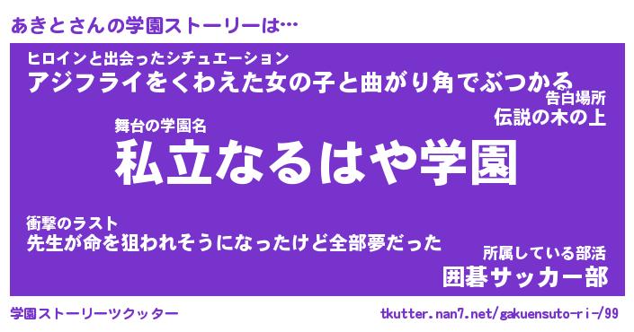 | 伝説のあだ名 | 『不死鳥のスナイパーあきと』 |
