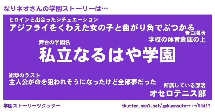 | 伝説のあだ名 | 『伝説のスナイパーなりネオ』 |