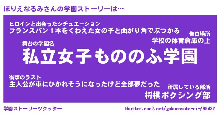 | 女子向けラノベタイトル風あだ名 | 『誰かこのほりえなるみを説明してください! ~契約から始まるウェディング~』 |