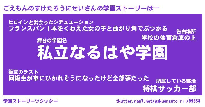 | 男性向けラノベタイトル風あだ名 | 『ごえもんのすけたろうにせいの憂鬱』 |