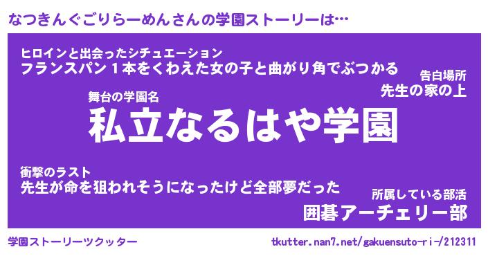 | 男性向けラノベタイトル風あだ名 | 『なつきんぐごりらーめんの憂鬱』 |
