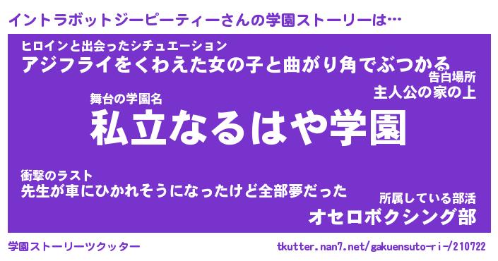 | 男性向けラノベタイトル風あだ名 | 『イントラボットジーピーティーの憂鬱』 |