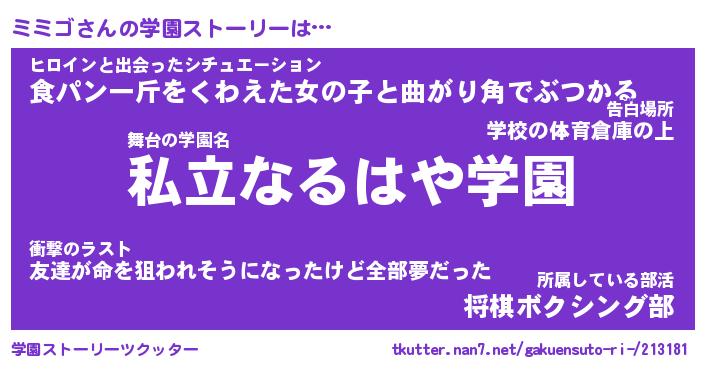 | 男性向けラノベタイトル風あだ名 | 『ミミゴの憂鬱』 |