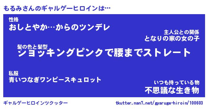 | ヘコむあだ名 | 『もるにー』『つくし』『もる太郎』 |