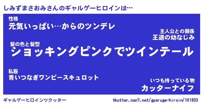 | 女子向けラノベタイトル風あだ名 | 『(仮)しみずまさおみのやんごとなき事情』 |