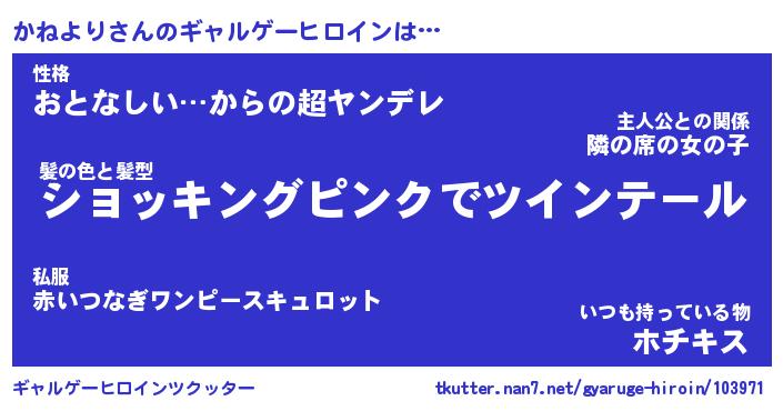 | 女子向けラノベタイトル風あだ名 | 『(仮)かねよりのやんごとなき事情』 |