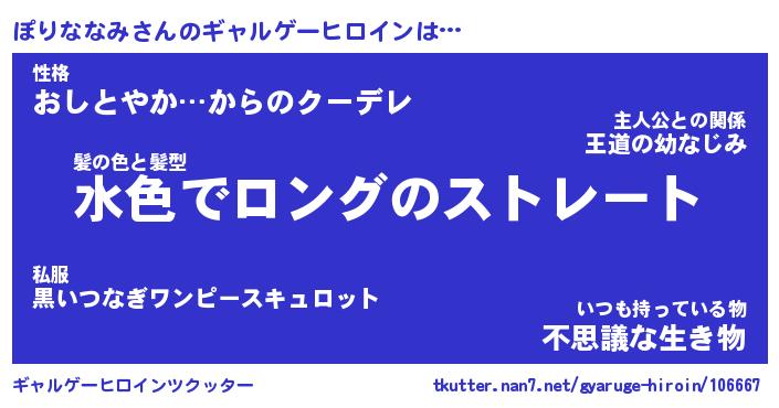 | 女子向けラノベタイトル風あだ名 | 『(仮)ぽりななみのやんごとなき事情』 |