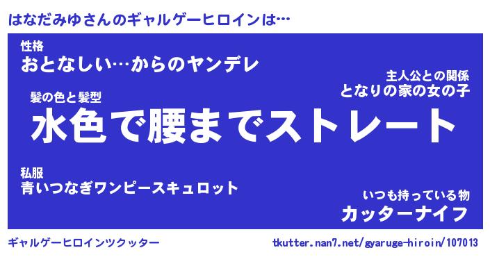 | 女子向けラノベタイトル風あだ名 | 『(仮)はなだみゆのやんごとなき事情』 |