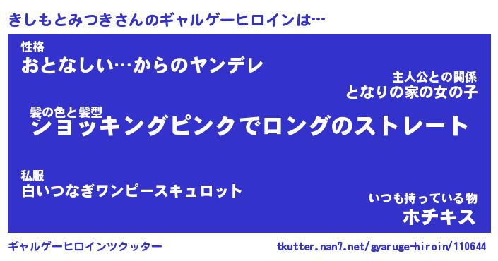 | 女子向けラノベタイトル風あだ名 | 『(仮)きしもとみつきのやんごとなき事情』 |
