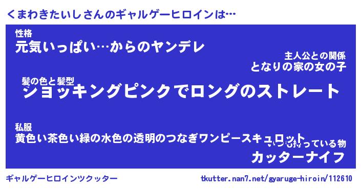 | 女子向けラノベタイトル風あだ名 | 『(仮)くまわきたいしのやんごとなき事情』 |