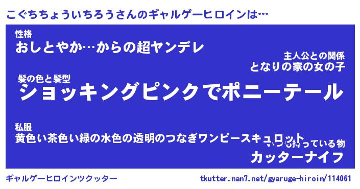 | 女子向けラノベタイトル風あだ名 | 『(仮)こぐちちょういちろうのやんごとなき事情』 |