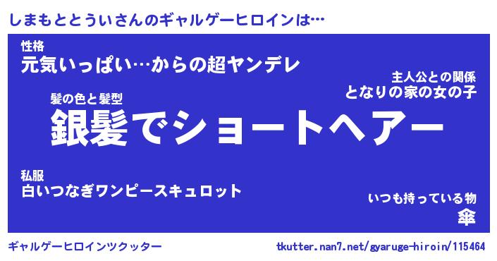 | 男性向けラノベタイトル風あだ名 | 『しまもととういの憂鬱』 |