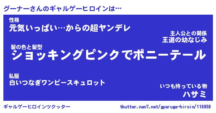 | 女子向けラノベタイトル風あだ名 | 『(仮)グーナーのやんごとなき事情』 |