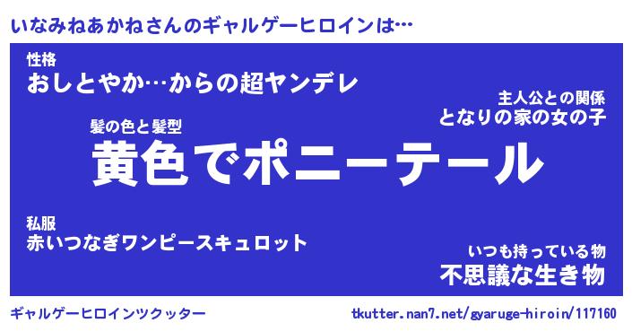| 女子向けラノベタイトル風あだ名 | 『誰かこのいなみねあかねを説明してください! ~契約から始まるウェディング~』 |