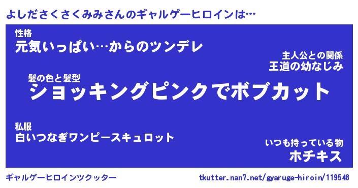 | 女子向けラノベタイトル風あだ名 | 『(仮)よしださくさくみみのやんごとなき事情』 |