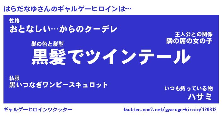 | 女子向けラノベタイトル風あだ名 | 『はらだなゆ姫と円卓の騎士』 |