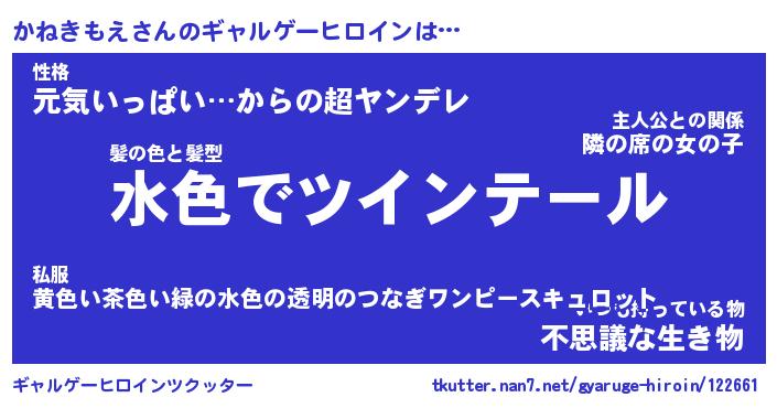 | 男性向けラノベタイトル風あだ名 | 『かねきもえの憂鬱』 |