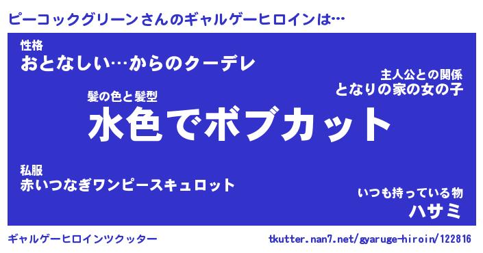 女子向けラノベタイトル風あだ名 | 『(仮)ピーコックグリーンのやんごとなき事情』 |