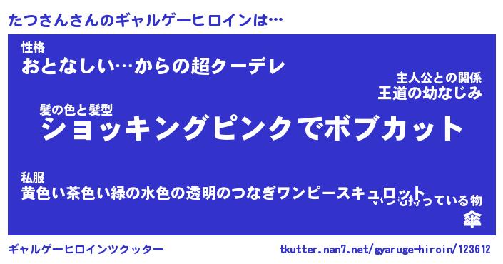 | 女子向けラノベタイトル風あだ名 | 『(仮)たつさんのやんごとなき事情』 |