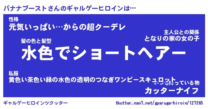 | 女子向けラノベタイトル風あだ名 | 『(仮)バナナブーストのやんごとなき事情』 |