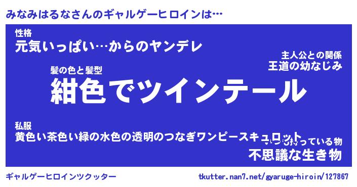 | ヒーロー風カッコイイあだ名 | 『スーパーミナミハルナ』『幻影騎士ミナ』 |