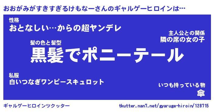 | 男性向けラノベタイトル風あだ名 | 『おおがみがすきすぎるけもなーの憂鬱』 |