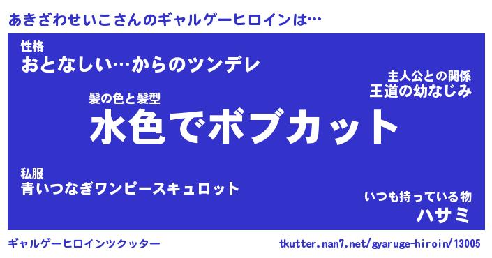 | 女子向けラノベタイトル風あだ名 | 『(仮)あきざわせいこのやんごとなき事情』 |