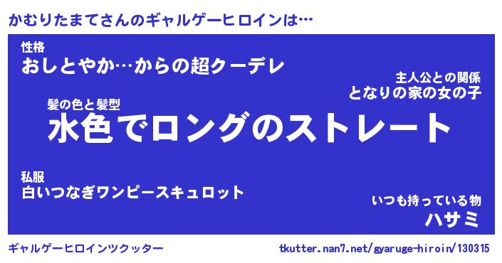 | 女子向けラノベタイトル風あだ名 | 『(仮)かむりたまてのやんごとなき事情』 |