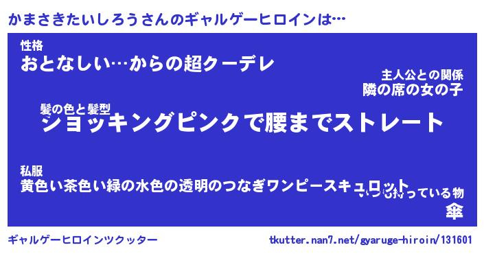 | 女子向けラノベタイトル風あだ名 | 『(仮)かまさきたいしろうのやんごとなき事情』 |