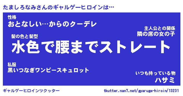 | 男性向けラノベタイトル風あだ名 | 『たましろなみの憂鬱』 |