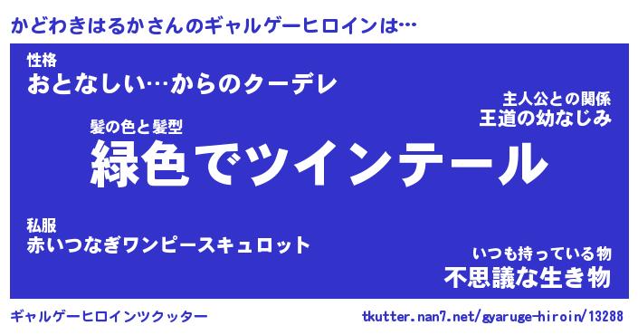 | 男性向けラノベタイトル風あだ名 | 『カドワキハルカアートオンライン』 |