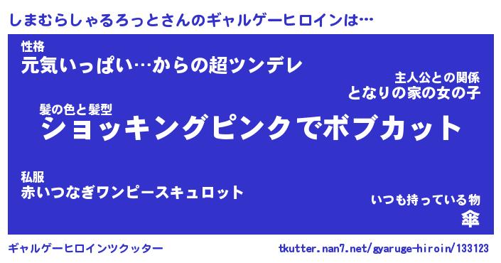 | 女子向けラノベタイトル風あだ名 | 『(仮)しまむらしゃるろっとのやんごとなき事情』 |