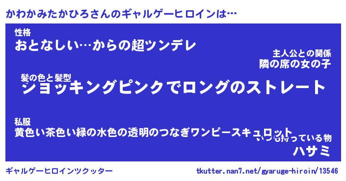 | 女子向けラノベタイトル風あだ名 | 『(仮)かわかみたかひろのやんごとなき事情』 |
