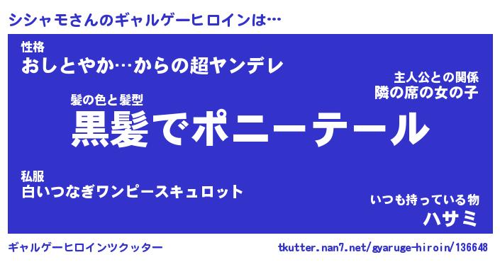 | ファンタジー風あだ名 | 『シシフェル』『エターナルシシャモー』 |