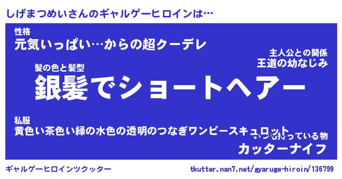 | 女子向けラノベタイトル風あだ名 | 『しげまつめい姫と円卓の騎士』 |