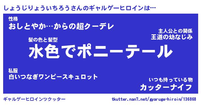 | 女子向けラノベタイトル風あだ名 | 『(仮)しょうじりょういちろうのやんごとなき事情』 |