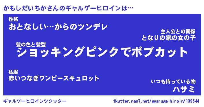 | 男性向けラノベタイトル風あだ名 | 『かもしだいちかの憂鬱』 |