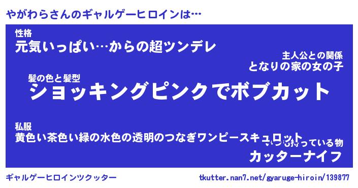| 女子向けラノベタイトル風あだ名 | 『(仮)やがわらのやんごとなき事情』 |